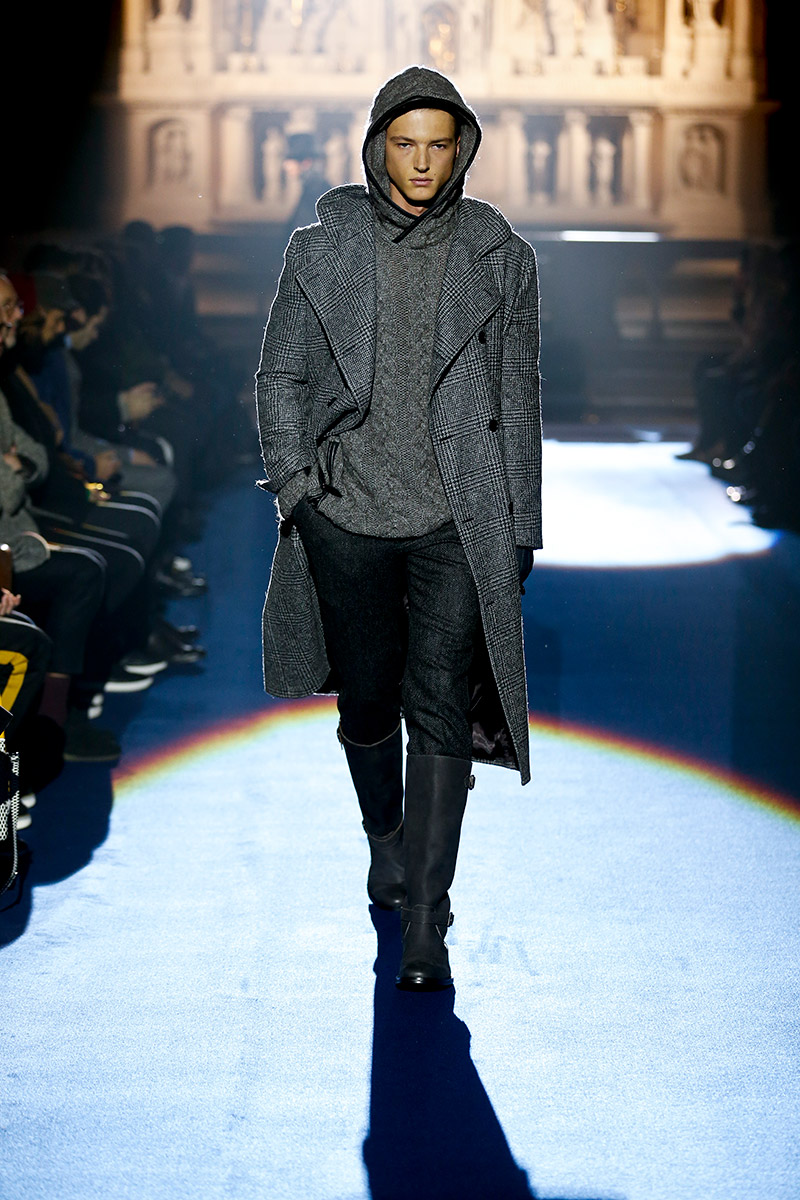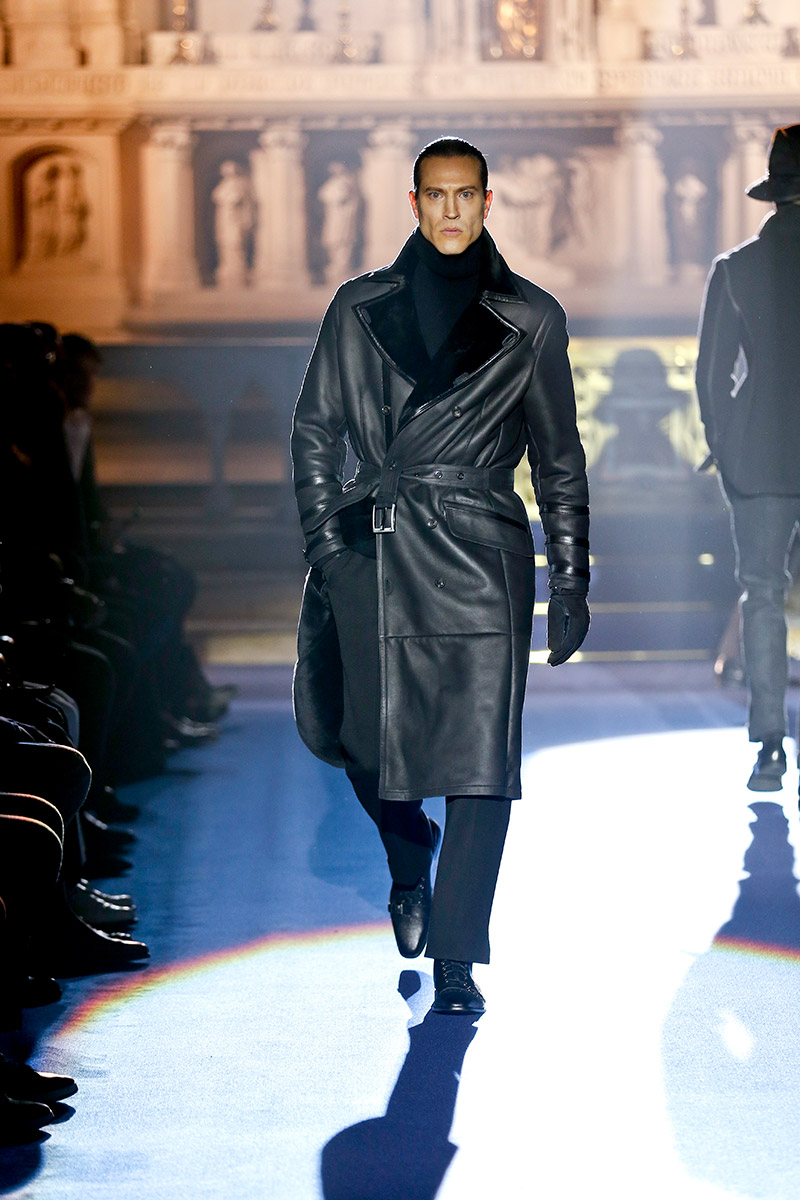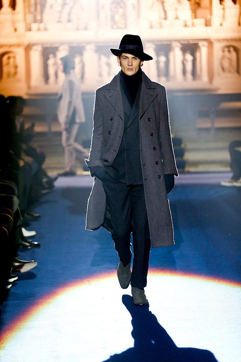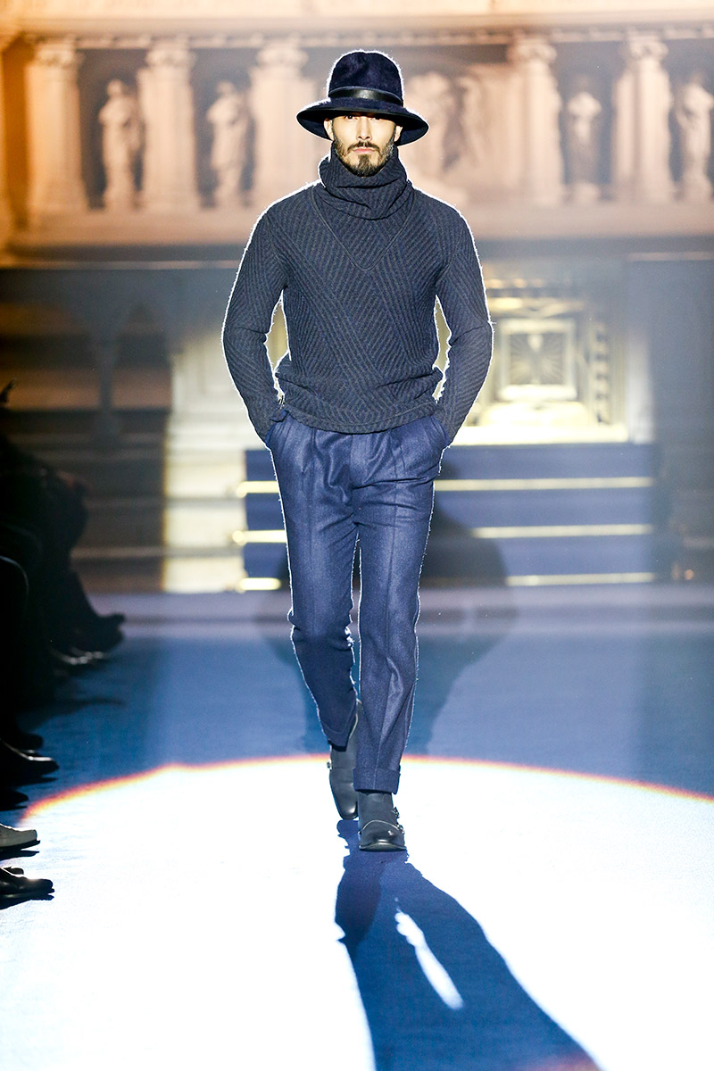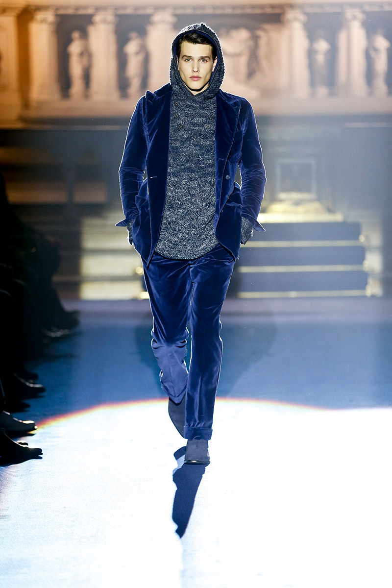 Paleta de culori constă în nuanțe de negru, gri închis, vinețiu, verde intens și albastru metalizat, evoluând apoi în crescendo către nuanțe de ivoriu angelic și alabastru. Textilele dau senzația de grandoare, prin materiale bogate ca jerseul, opulente ca brocartul, prin împletituri în solzi de pește, prin pielea matlasată și catifeaua în ape. Și stratificarea hainelor are importanța sa, prin abordarea de tip casual a cașmirului, a hainelor pe gât și a tricotajelor bogate.