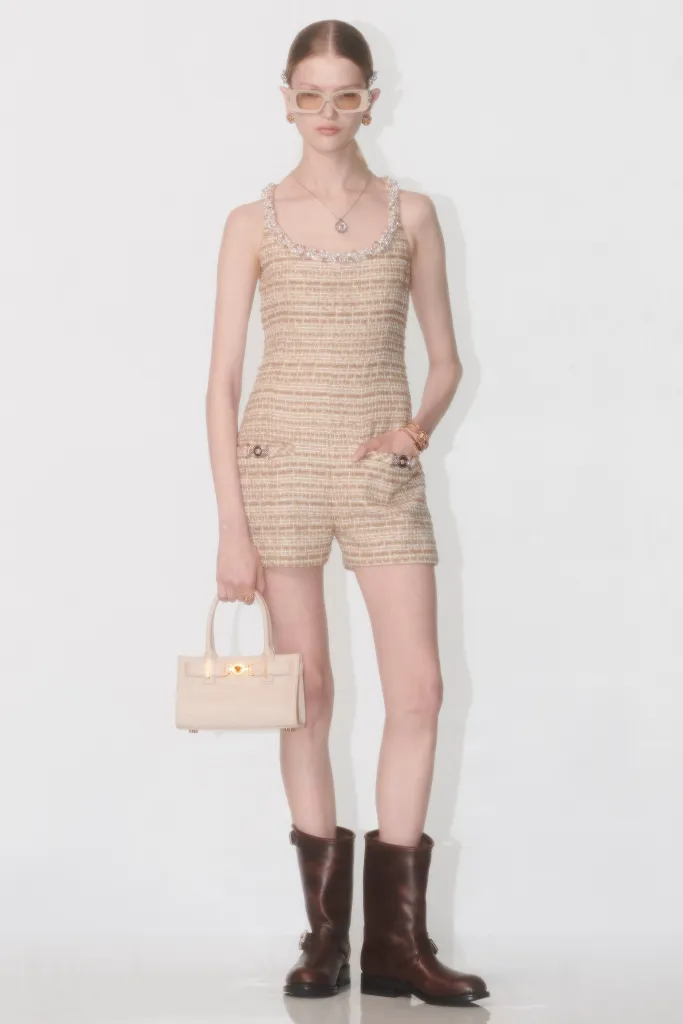 Croielile au fost în mod special în centrul atenției, atât în costumele ușoare din lână răcoroasă, cât și în opțiunile mai adecvate pentru ținutele de seară, incluzând un mini-rochie smoking cu o formă feminină și ascutită, amintind de siluetele fermecătoare ale show-ului Versace din toamna anului 2023, ținut în Los Angeles în martie.