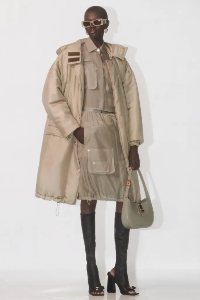 Donatella Versace își continuă eforturile de a comunica acest spirit, consolidând mai departe elementele iconice ale casei, acum reinterpretate în noi materiale. Obiectivul colecției a fost de a oferi arhetipuri vestimentare în cea mai bună formă și croială, incluzând paltonul perfect din cașmir, costumul bine croit, tricotajele perfecte și chiar și pantalonii cargo, un articol pe care directorul creativ al brandului pare să îl favorizeze în ultima vreme.