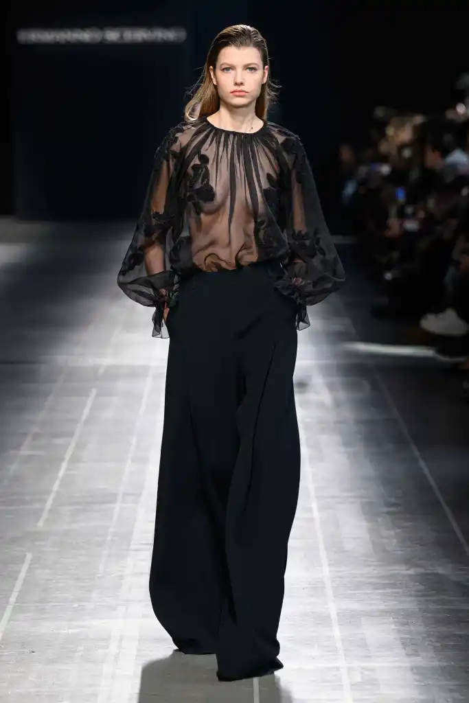 Țesăturile clasice masculine – de la lână cu dungi pinstripe la grisaille – sunt transformate în croieli rafinate cu construcții elaborate ascunse, de la blazerele ce conturează corpul în formă de clepsidră și paltoanele supradimensionate din stofă cu umeri căzuți, la rochii bustiere învolburate din lână dublă ce conturează silueta pentru colecția Ermanno Scervino FW24. Costumele cenușii metalizat vin cu pantaloni largi care contribuie la pași dramatici și cu blazere strânse și jachete spencer.